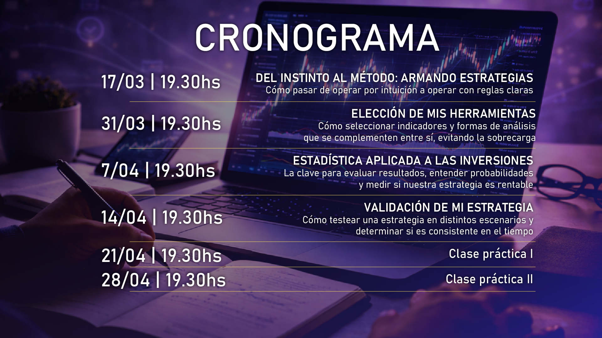 AT4 está pensado para quienes completaron AT2 y AT3 y quieren potenciar al máximo todo lo aprendido. En este curso no solo integrás las herramientas anteriores, sino que aprendés a crear tu propio sistema de operaciones, basado en resultados y no en intuiciones. Salir del “operar al aire” para pasar a un método claro, medible y mejorable te permite saber si tu sistema es rentable, cuánto lo es y qué ajustar para seguir creciendo con seguridad.