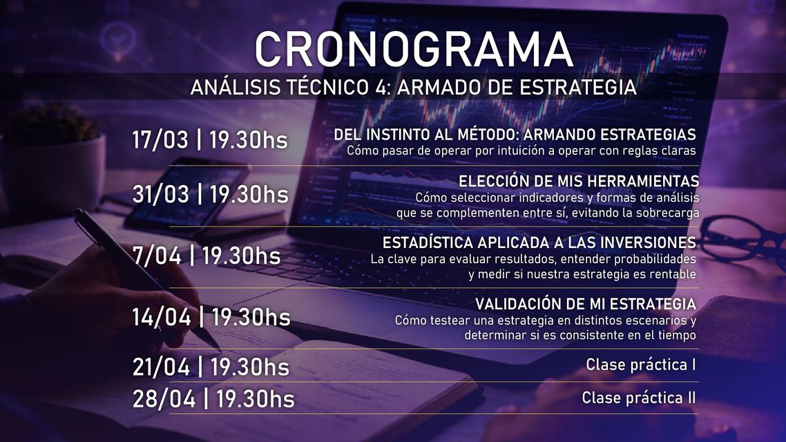 Durante 6 clases en vivo, vas a construir tu propia estrategia desde cero. No se trata de copiar sistemas, sino de entender cómo diseñar uno que tenga lógica, coherencia y respaldo estadístico.