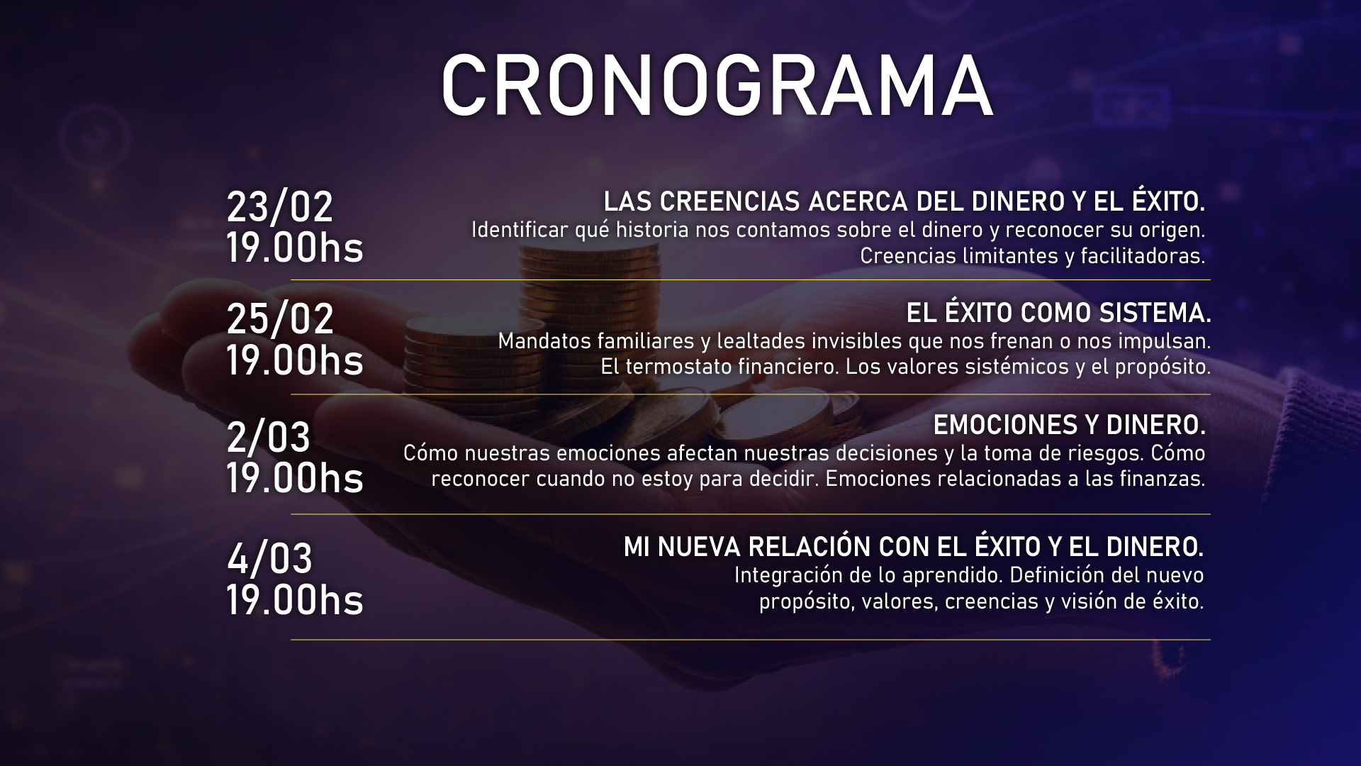 Un curso que brindar a los participantes un espacio de reflexión y herramientas prácticas para identificar y transformar las creencias limitantes y los patrones sistémicos que condicionan su capacidad de generar, gestionar y disfrutar la abundancia. El curso busca que cada alumno logre una integración saludable entre su bienestar emocional y su estrategia financiera, redefiniendo el éxito desde un propósito personal y sostenible.